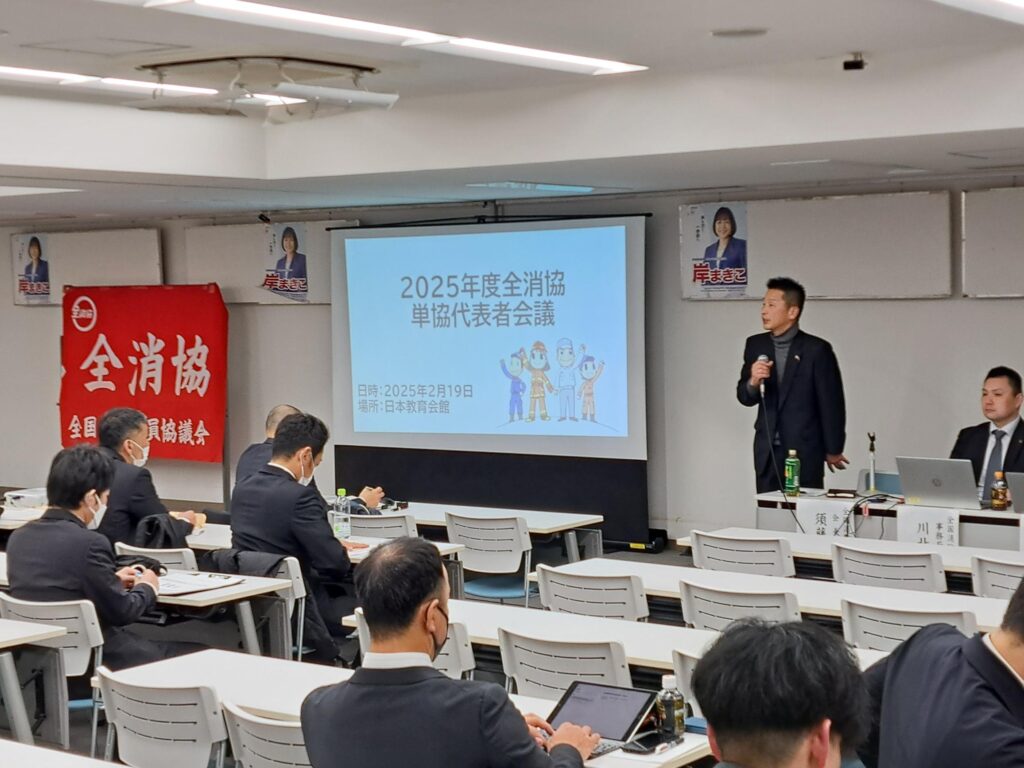 18日は冒頭単協代表者会議を行い、主催者代表して全消協の須藤洋典会長、続いて自治労の林鉄兵総合労働局長があいさつした。