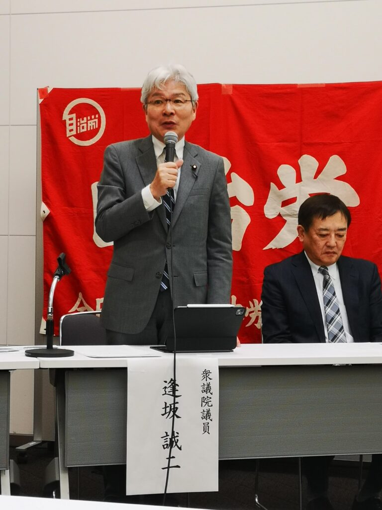 続いて、鬼木まこと参議院議員から、「政治闘争に取り組む必要性」と題して、第27回参議院議員選挙で、自治労組織内の岸まきこ議員を引き続き国会に送る意義や重要性についてご講演いただいた。