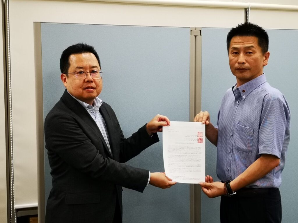 田中消防・救急課長と要望書を交わし、消防職員の現状について訴えた。